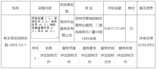 本项目需要项目经理 1 人,保安队长 1 人,保安队员 81 人,消防控制室操作员 6 人,共计 89 人。详细内容见招标文件第五部分“招标项目采购需求”(采购需求可在新乡市公共资源交易中心网站本项目招标公告后下载)。