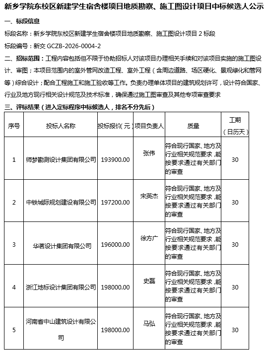 永利集团东校区新建学生宿舍楼项目地质勘察、施工图设计项目中标候选人公示